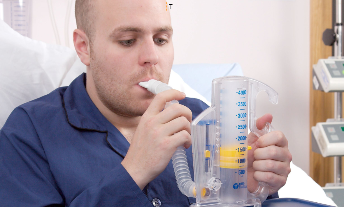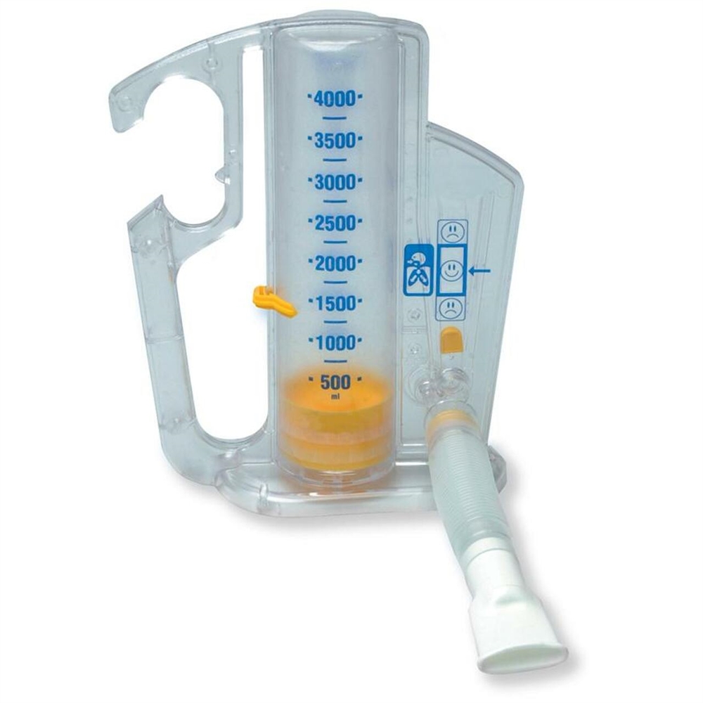 - 一個可見的活塞、易於理解的圖像(指示正確的吸氣流量)和底部的說明,幫助患者在沒有直接監督的情況下進行和監測他們自己的術後呼吸練習。