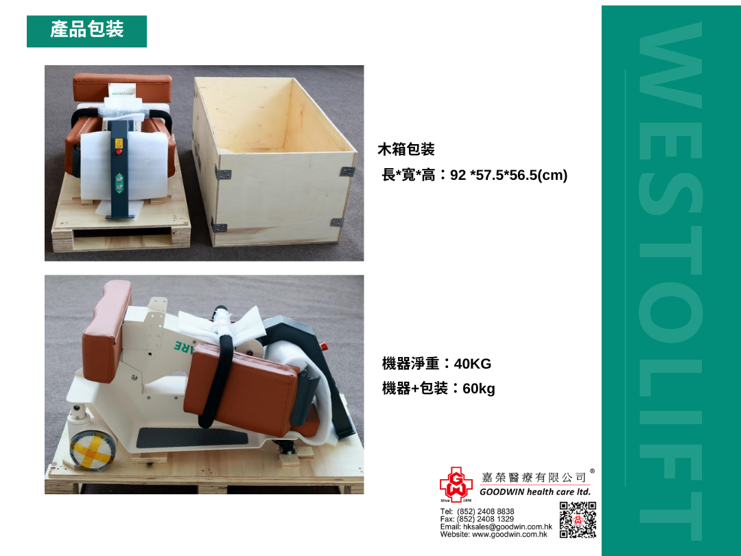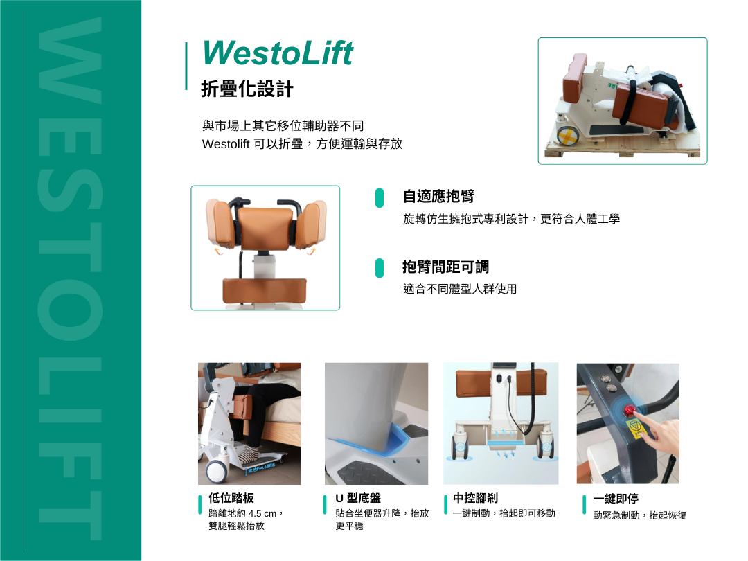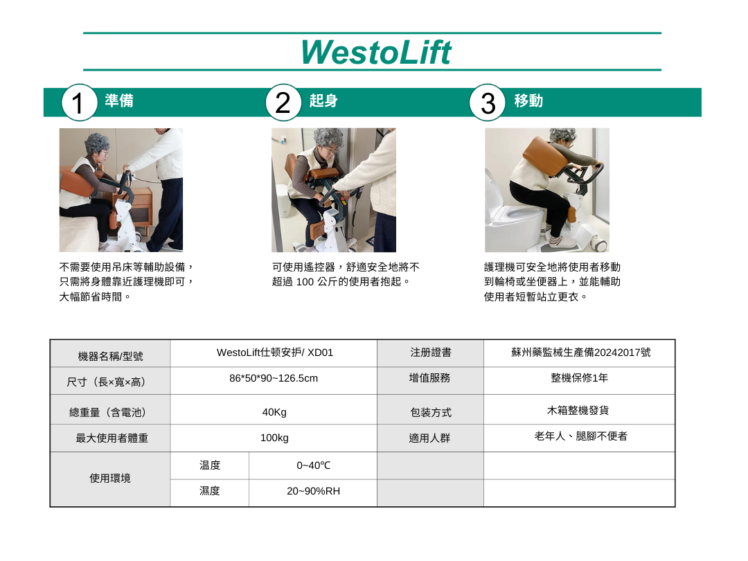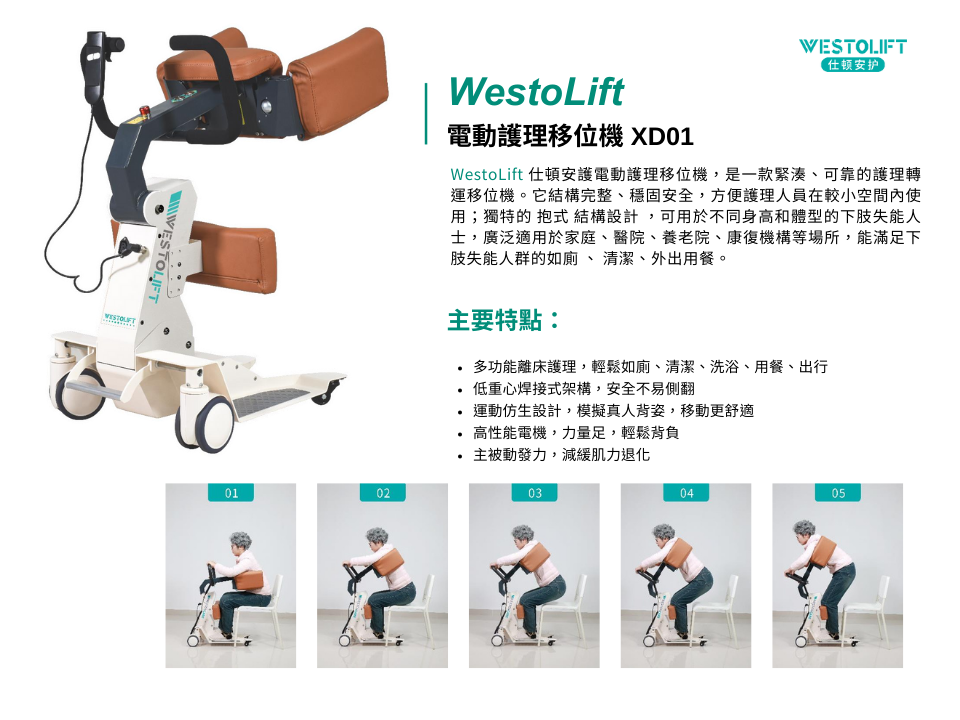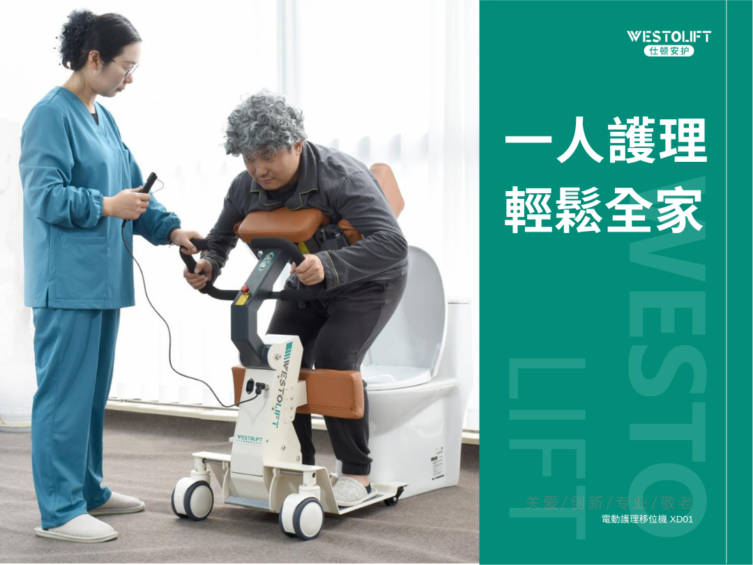 WestoLift 仕頓安護電動護理移位機,是一款緊湊、可靠的護理轉運移位機。它結構完整、穩固安全,方便護理人員在較小空間內使用;獨特的抱式結構設計,支援不同身高和體型的下肢失能人士使用,廣泛適用於家庭、醫院、養老院、康復機構等場所,能滿足下肢失能人群的如廁、清潔、外出用餐。