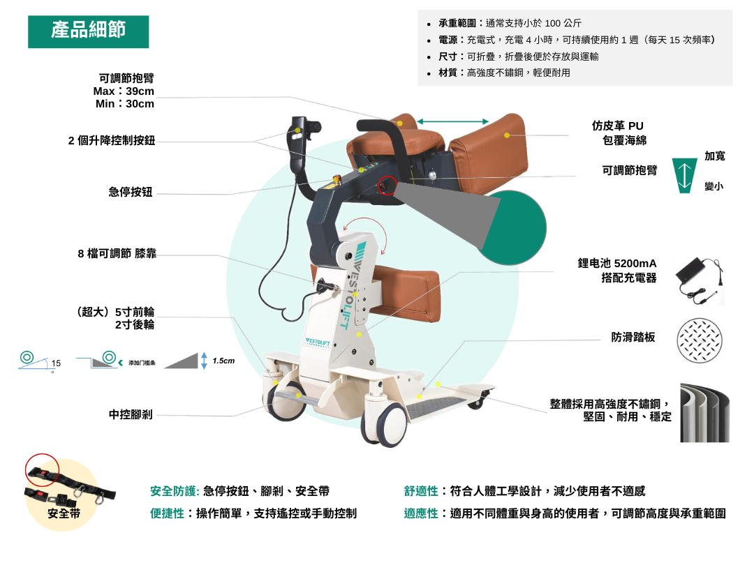 - 多功能離床護理,輕鬆如廁、清潔、洗浴、用餐、出行